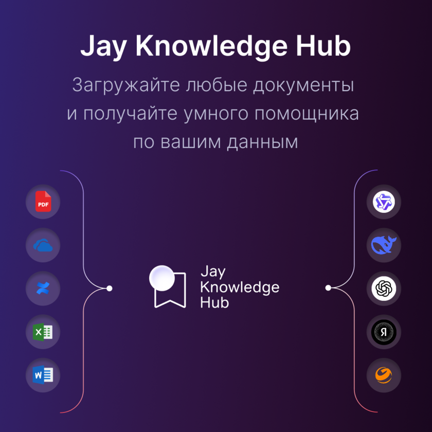 Jay Knowledge Hub способна обрабатывает документы любых форматов: от классических Word и PDF до сложных корпоративных систем вроде Confluence и Jira. Встроенный OCR-движок извлекает информацию даже из графических материалов, а мультимодальный парсер с искусственным интеллектом автоматически очищает, структурирует и обогащает данные.