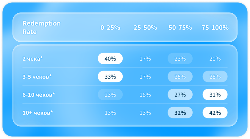 - Отсутствие мотивации к использованию баллов из-за их бессрочности. Для примера, покупатели, у которых было всего 2 чека за год, в 40% случаев почти не использовали накопленные баллы.