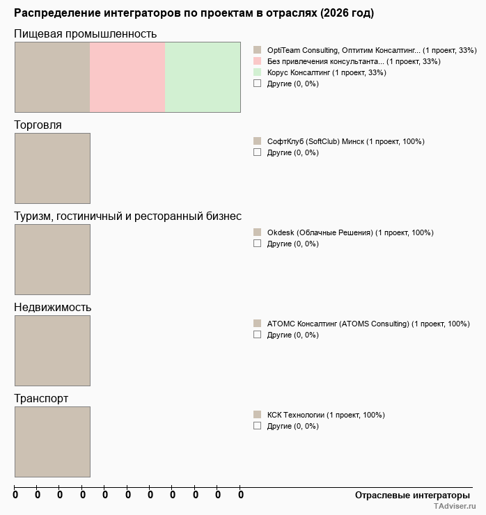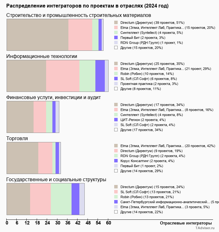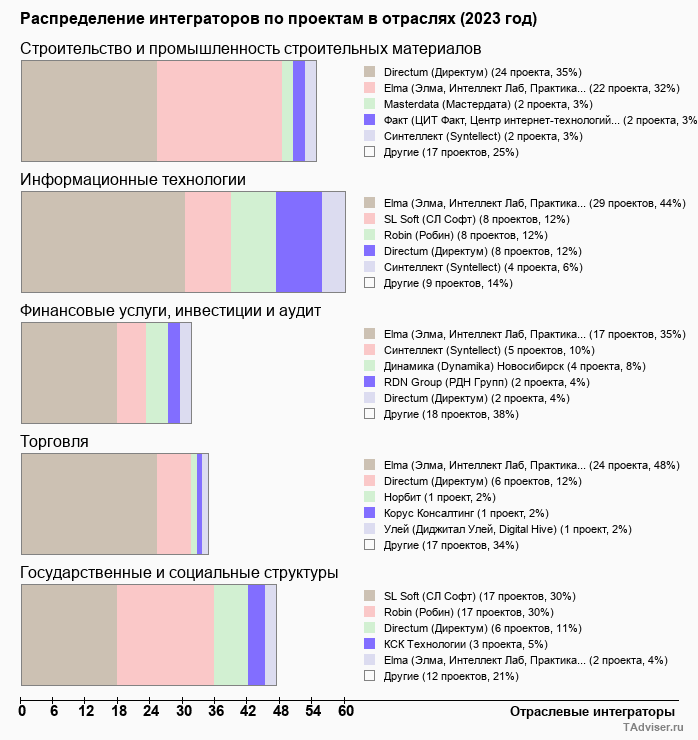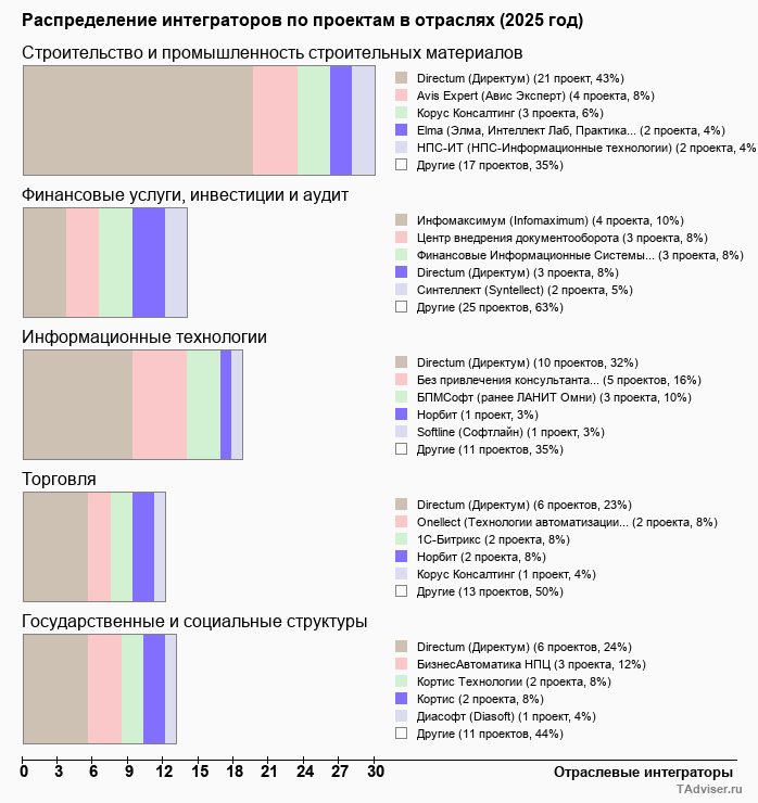 Согласно информации о проектах, содержащейся в базе TAdviser, за последние 4 года BPM-системы чаще всего внедрялись в пяти отраслях - в строительстве, в сфере информационных технологий, а также в финансовых компаниях, ритейлерах и в госсекторе. На их долю приходится 46,7% от всех реализованных проектов, известных TAdviser.