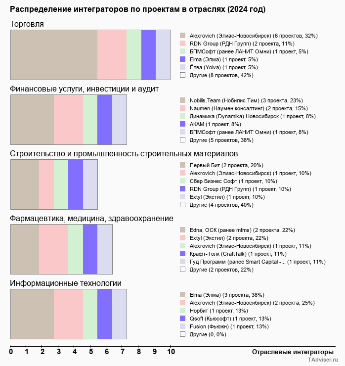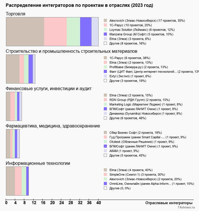 Согласно информации о проектах, содержащейся в базе TAdviser, за 2023-2025 гг. CRM-системы чаще всего внедрялись в торговле, в сфере финансовых услуг, в строительстве, ИТ и здравоохранении. На долю этих отраслей приходится 51% от всех реализованных проектов, известных TAdviser.