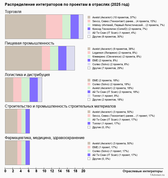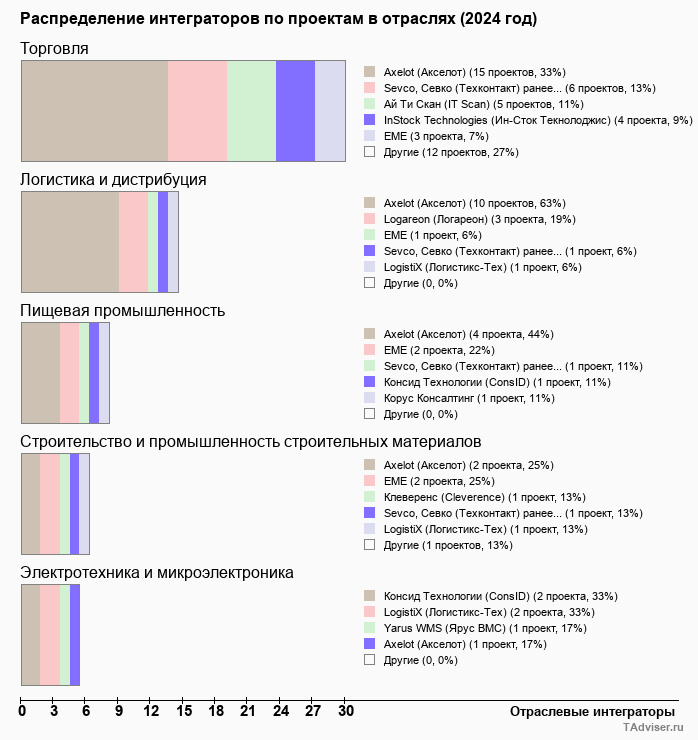 Чаще всего системы WMS внедряются в сфере торговли, логистики и дистрибуции, пищевой промышленности. Суммарная доля внедрений в этих отраслях, по оценке TAdviser, составляет свыше 65%. В 2025 году отмечается рост числа внедрений в пищевой промышленности и небольшой всплеск в медицинской отрасли.